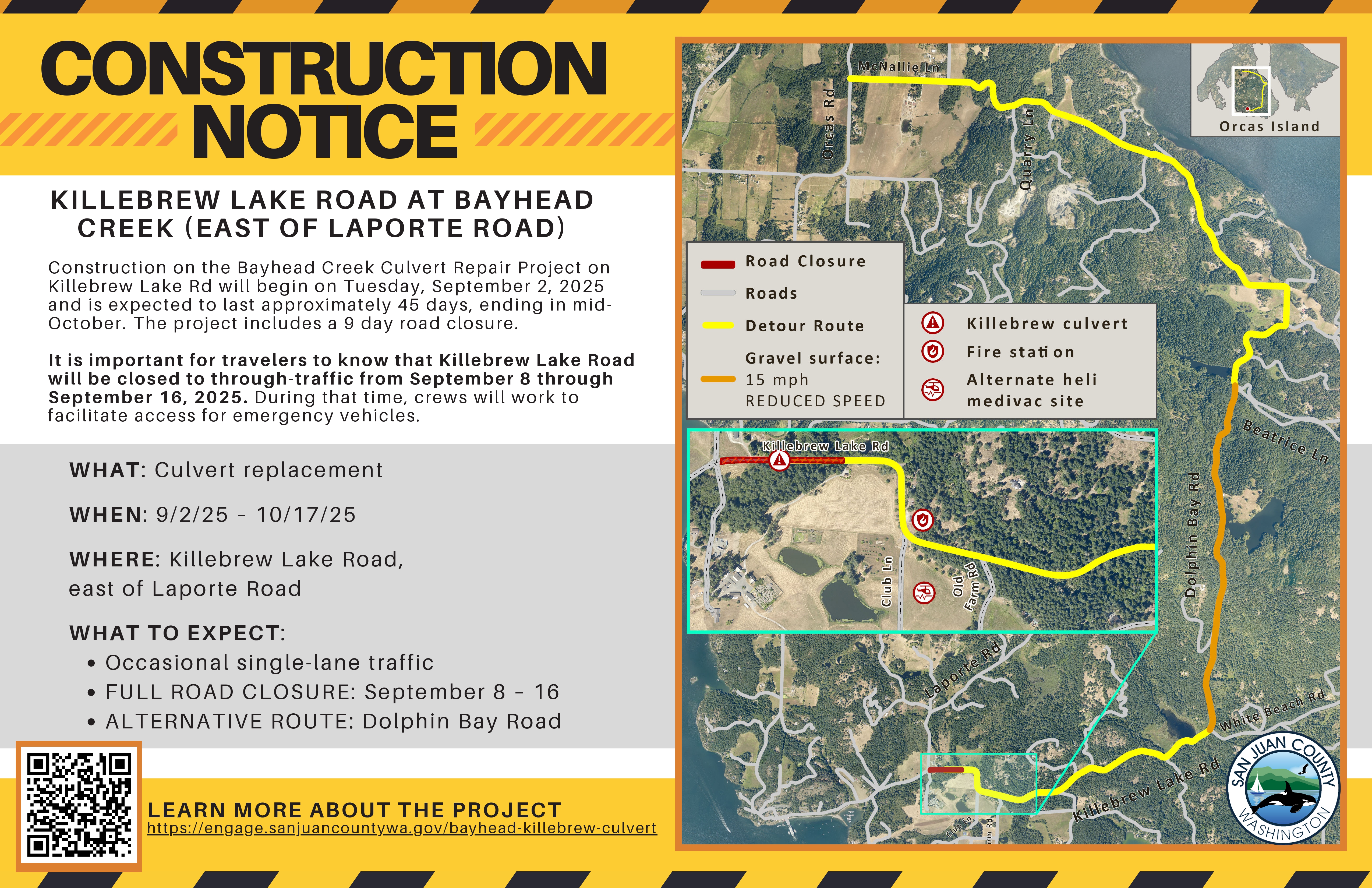 Share Reminder: Construction Begins Sept. 2nd for Bayhead Creek Culvert Project on Killebrew Lake Rd, Orcas Island on Facebook Share Reminder: Construction Begins Sept. 2nd for Bayhead Creek Culvert Project on Killebrew Lake Rd, Orcas Island on Twitter Share Reminder: Construction Begins Sept. 2nd for Bayhead Creek Culvert Project on Killebrew Lake Rd, Orcas Island on Linkedin Email Reminder: Construction Begins Sept. 2nd for Bayhead Creek Culvert Project on Killebrew Lake Rd, Orcas Island linkSAN JUAN COUNTY, WA. August 18, 2025 – Construction on the Bayhead Creek Culvert Repair Project on Killebrew Lake Rd on Orcas Island will begin on Tuesday, September 2, 2025 and is expected to last until mid-October. It is important for travelers to know that Killebrew Lake Road will be closed to through-traffic from September 8 through September 16, 2025. During the nine-day road closure, Dolphin Bay Road will be the detour. A 20mph speed limit will be in place along Dolphin Bay Road and drivers are encouraged to use caution, turn-on headlights, and add extra time to your commute.